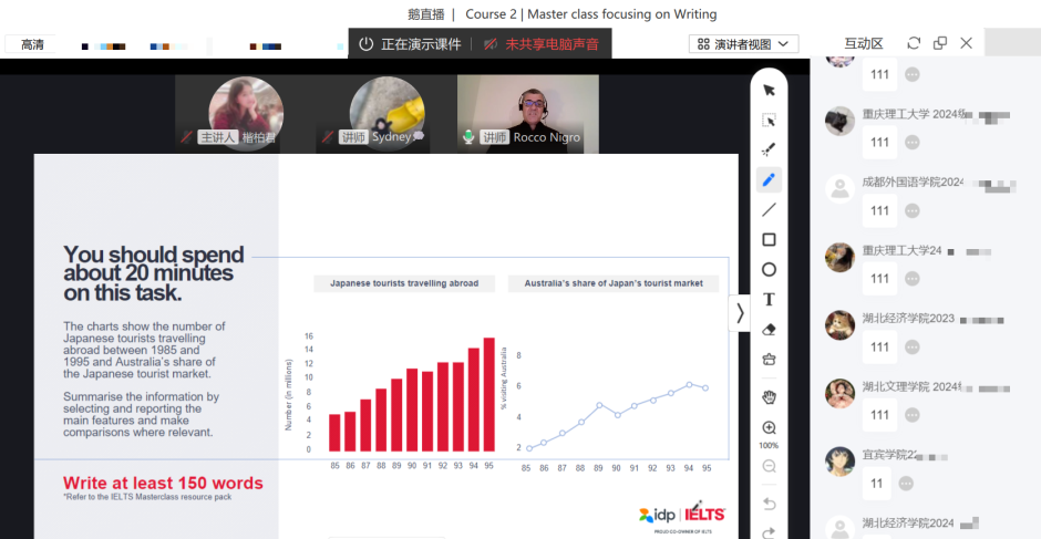活动课程由资深雅思考官Rocco Nigro亲自授课,课程内容围绕雅思考试基础知识、科学学习规划与核心应试技巧全面展开。课程聚焦听、说、读、写四大模块,结合真实考题案例,以全英文的沉浸式教学环境,为同学们带来了一场知识与趣味并存的语言学习盛宴。在课堂上,我校学子全神贯注,积极通过弹幕互动、在线提问等方式与名师交流,展现了浓厚的学习热情和良好的互动精神。